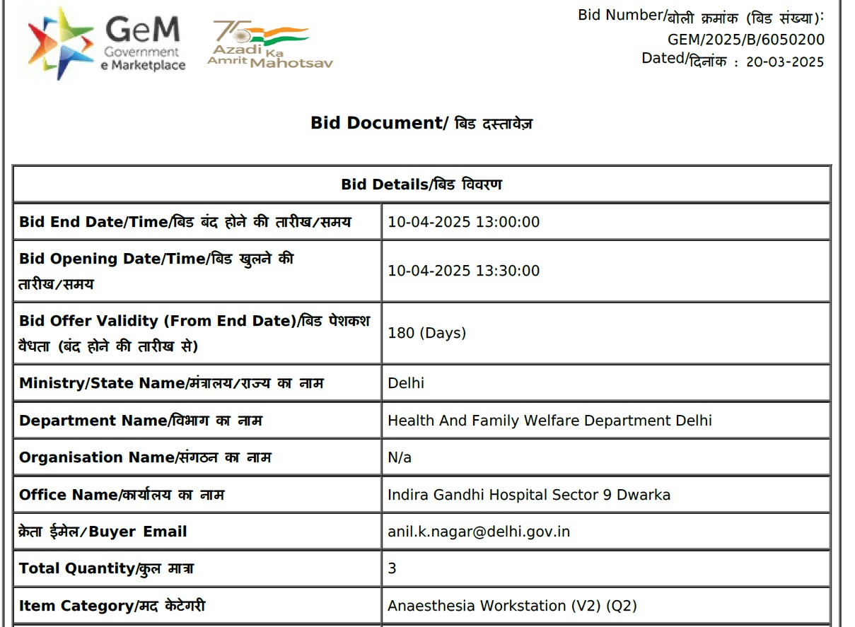 ender notice for procurement of Anesthesia Workstation (Bid on GeM) at Indira Gandhi Hospital